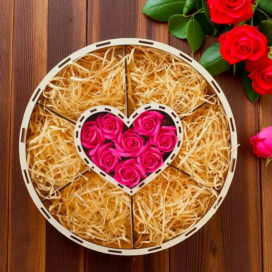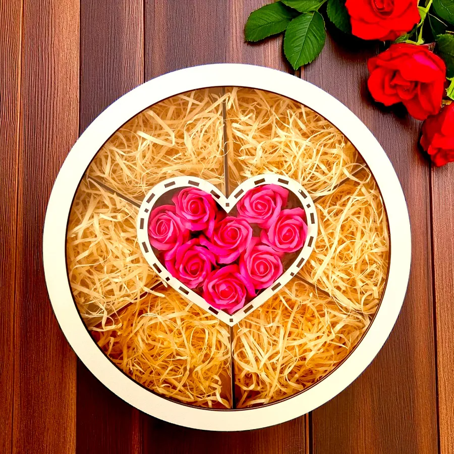 Pudełko ma 35 cm średnicy i 7 cm wysokości, co daje sporo miejsca do stworzenia estetycznej kompozycji. W centralnym punkcie znajduje się wycięte serce, które staje się ozdobnym centrum zestawu.
