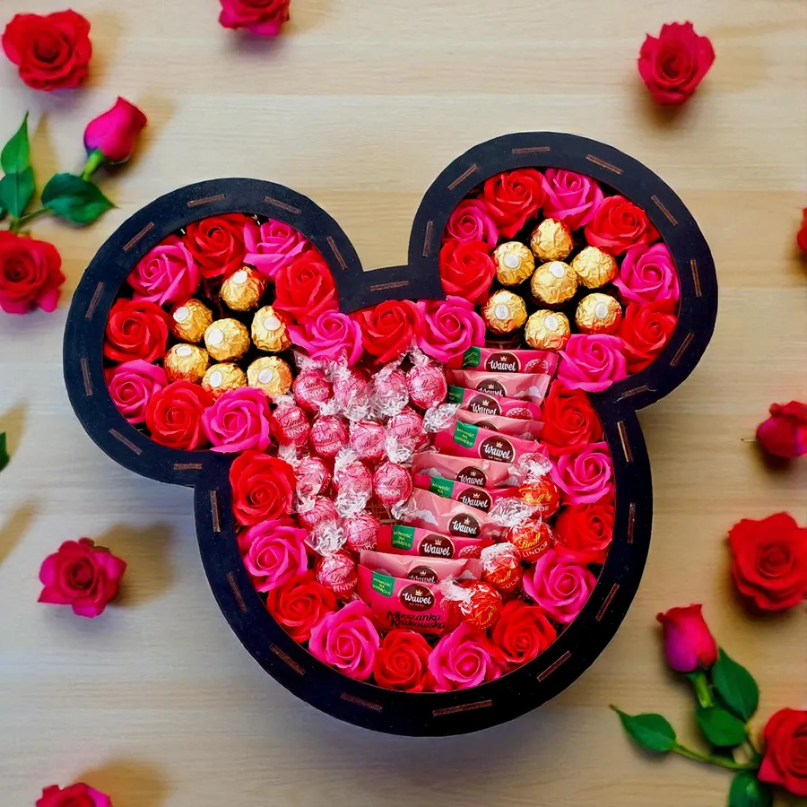 Czerń pudełka symbolizuje klasę, a serce Myszki Miki dodaje mu uroku i oryginalności. To upominek, który łączy dziewczęcy wdzięk z wyrafinowanym stylem. W środku ukryte są elementy, które pobudzają zmysły i przywołują uśmiech – od aromatycznych róż mydlanych po delikatne słodycze. Każdy detal dopracowano tak, by całość prezentowała się perfekcyjnie i wywoływała efekt „wow” 🎁.
