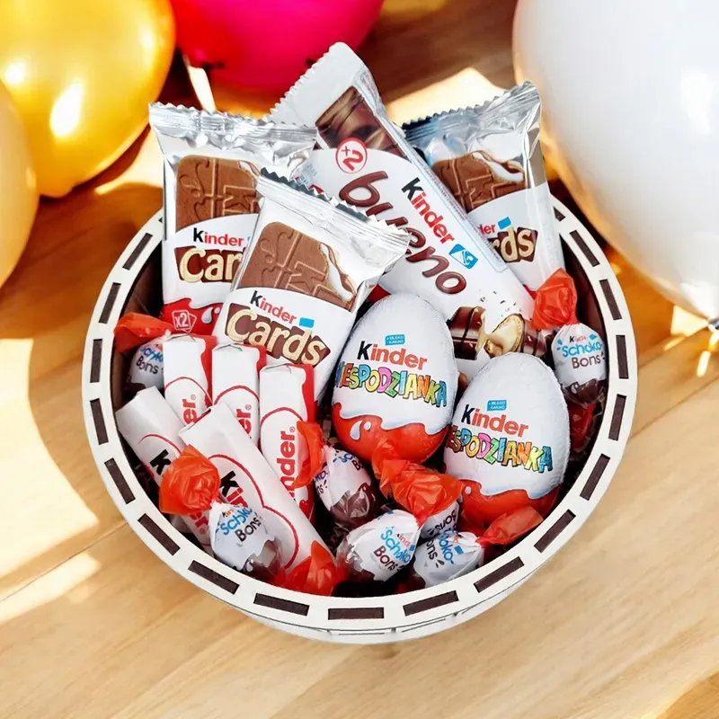 Wnętrze oparto na popularnych i lubianych słodyczach, które są łatwe w odbiorze i kojarzą się z przyjemnym smakiem. Dzięki temu niespodzianka jest nie tylko efektowna wizualnie, ale również bezpieczna pod względem wyboru zawartości.