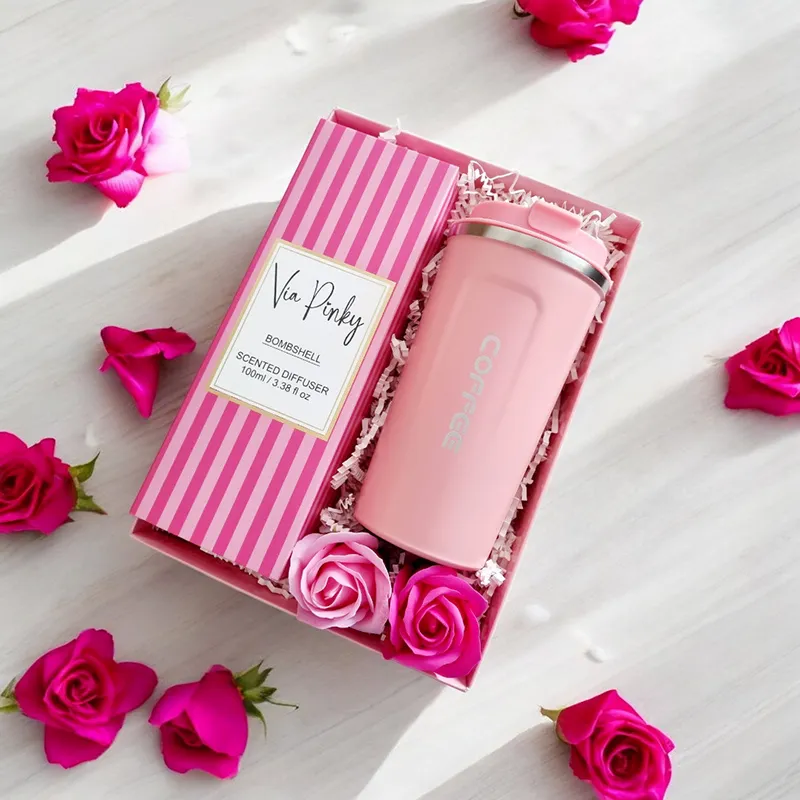 W zestawie znajduje się różowy termos 510 ml, patyczki zapachowe oraz róże mydlane. To czytelna kompozycja bez przypadkowych elementów: jeden praktyczny produkt, jeden akcent do wnętrza i delikatne dodatki, które dopełniają całość wizualnie. Dzięki temu od razu wiadomo, co dokładnie znajduje się w pudełku i jaki charakter ma ten zestaw.