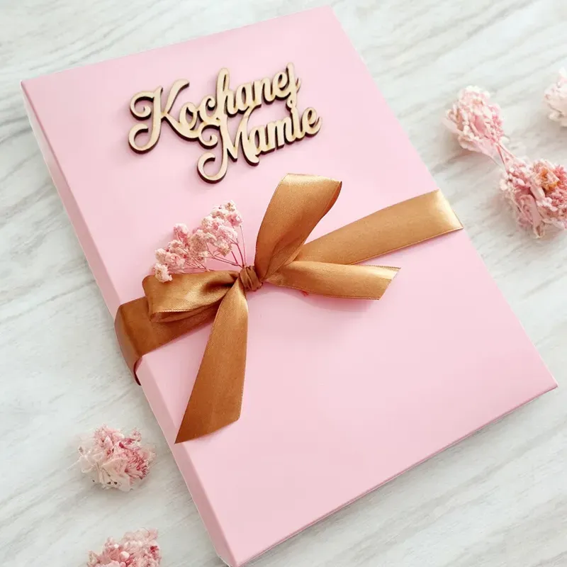Pudełko wykonano z ozdobnego, błyszczącego kartonu w różowym kolorze i zamknięto pełnym wieczkiem. Po zamknięciu jest przewiązane złotą wstążką, a wariant wieczka zależy od wybranego modelu. Przed wysyłką całość jest zabezpieczana w opakowaniu wysyłkowym tak, aby ograniczyć przesuwanie się elementów podczas transportu.