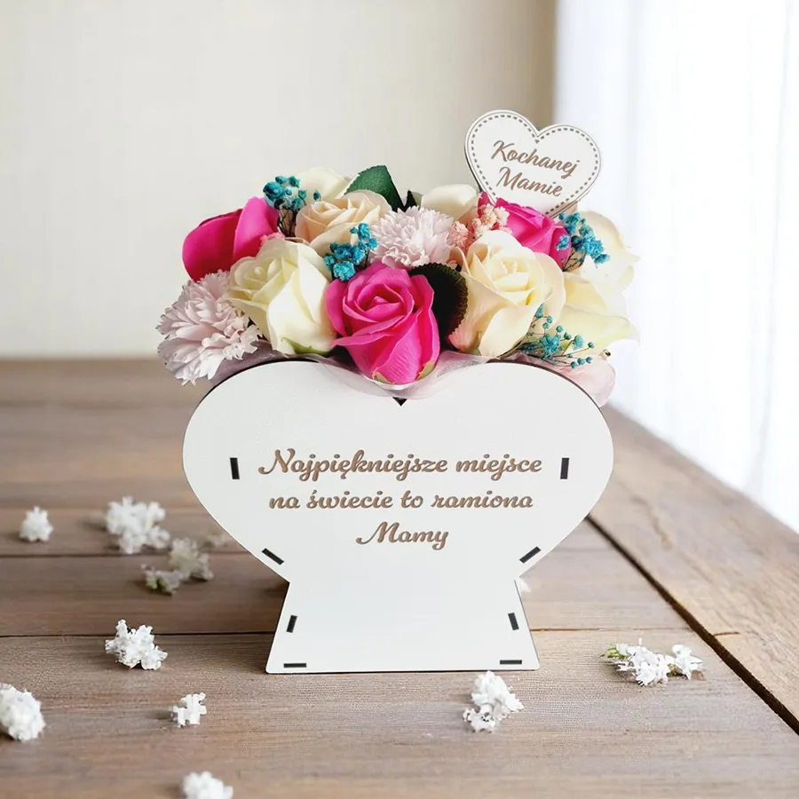 Najlepiej opisać go jako połączenie obu tych funkcji. Z jednej strony wygląda jak dekoracyjna kompozycja kwiatowa, którą można postawić w domu, z drugiej – dzięki grawerowi i drewnianemu sercu ma bardzo wyraźny, osobisty charakter. To nie jest zwykła ozdoba, tylko upominek z przesłaniem.