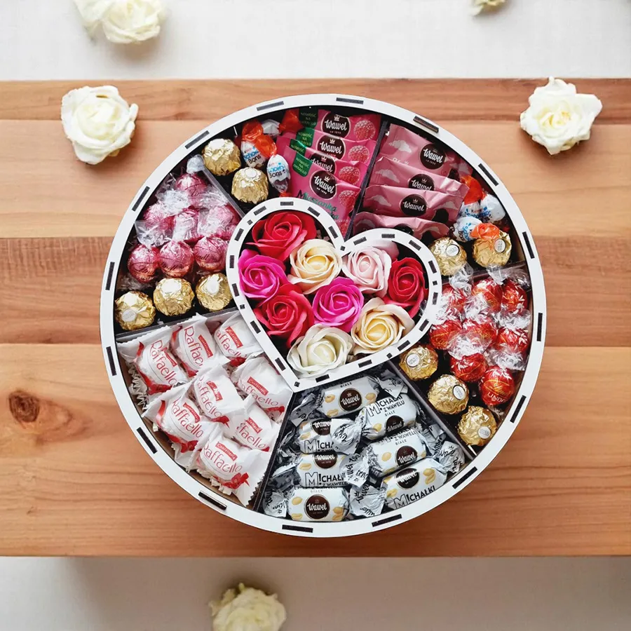Pudełko wykonano z białej płyty HDF, dzięki czemu całość prezentuje się schludnie, stabilnie i estetycznie. Przezroczyste okienko w wieczku pozwala od razu zobaczyć kompozycję, a środkowa przegródka w kształcie serca porządkuje układ i nadaje mu bardziej dopracowany charakter.