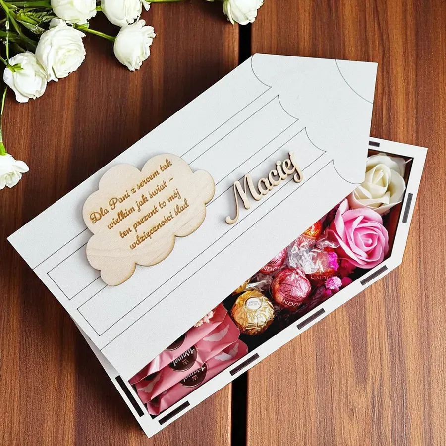 Dużym atutem jest także możliwość personalizacji. Na wieczku znajduje się drewniana chmurka z dedykacją, a dodatkowy napis może zawierać imię ucznia, uczennicy albo numer klasy. Taki detal sprawia, że prezent wygląda jak przygotowany specjalnie dla konkretnej nauczycielki lub konkretnego nauczyciela, a nie jak przypadkowy gotowy produkt.