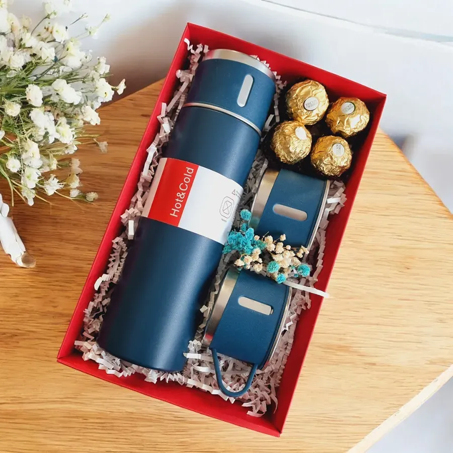 Pudełko z kubkiem termicznym i słodkościami to fizyczna kompozycja zamknięta w czerwonym, prostokątnym opakowaniu, w której po otwarciu widoczny jest niebieski kubek termiczny typu hot&cold oraz uporządkowana słodka zawartość. Całość prezentuje się czytelnie i spójnie już przy pierwszym kontakcie.