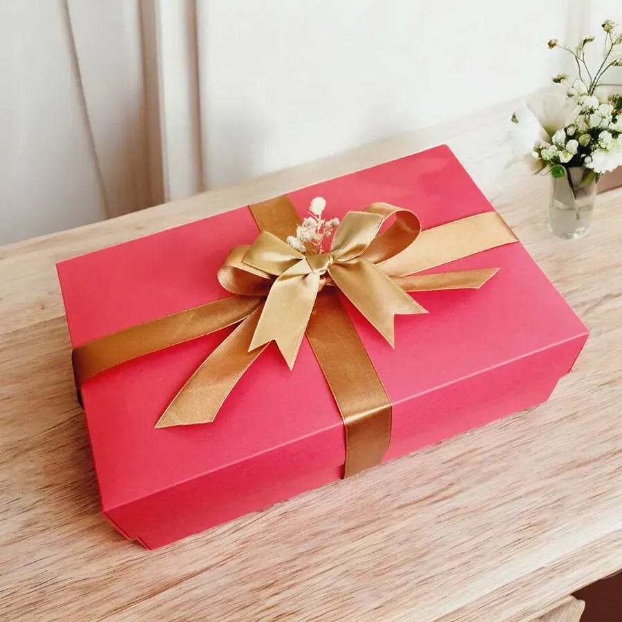 Drugie zdjęcie pokazuje pudełko w wersji zamkniętej. Czerwone wieczko zakrywa całość zawartości, a złota wstążka biegnąca przez środek porządkuje bryłę i domyka kompozycję wizualną. Widok z góry pozwala ocenić proporcje pudełka oraz jego kompaktowy rozmiar.