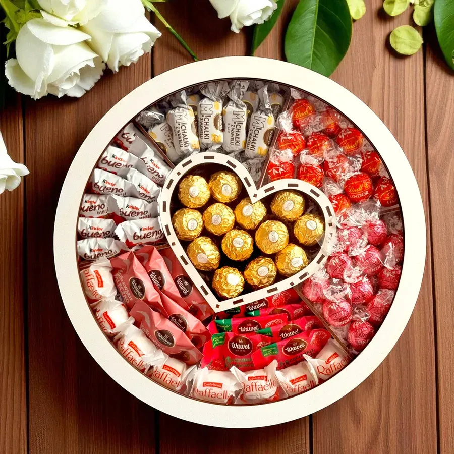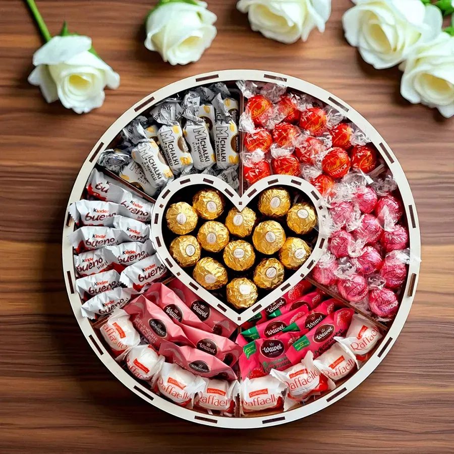 Pudełko wykonano z białej płyty HDF i podzielono na przegródki, które rozdzielają słodycze i pomagają utrzymać ich ułożenie. Serce w centrum jest stałym punktem kompozycji, dzięki czemu całość wygląda spójnie nawet przy dużej liczbie elementów. Przy wysyłce pudełko jest domknięte i zabezpieczane w opakowaniu wysyłkowym tak, aby ograniczyć przesuwanie się zawartości w transporcie.