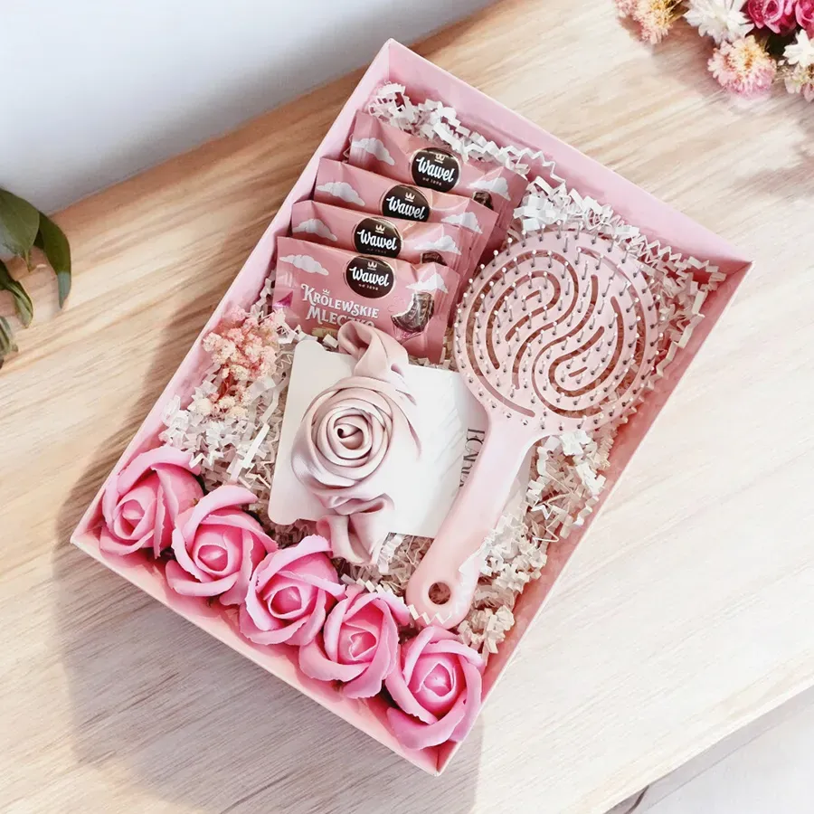 Po otwarciu widać różową szczotkę do włosów i gumkę jako główne elementy zestawu. Obok znajdują się róże mydlane oraz Ptasie Mleczko jako słodki dodatek. Całość jest ułożona tak, że zawartość widać od razu po podniesieniu wieczka.