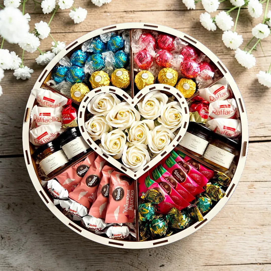 Najmocniej wyróżnia go środkowa przegródka w kształcie serca, białe róże mydlane oraz bogata kompozycja słodyczy i dodatków.