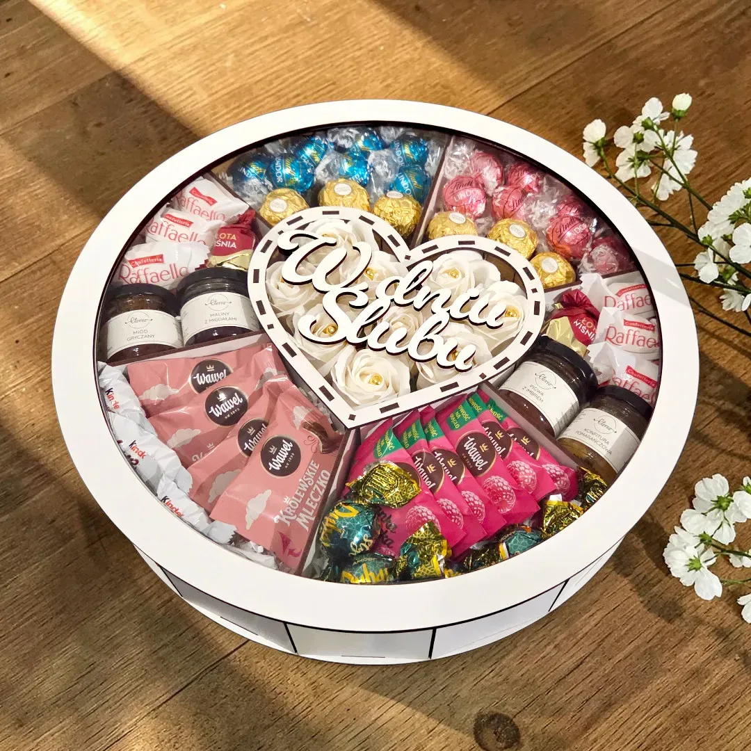Ślubne pudełko z sercem, białymi różami i słodką kompozycją dobrze odpowiada na tę potrzebę. Łączy efektowną oprawę z bogatą zawartością, centralnym sercem i jasnym ślubnym charakterem, dlatego sprawdza się jako prezent dla Pary Młodej, który wygląda elegancko już w chwili wręczenia.