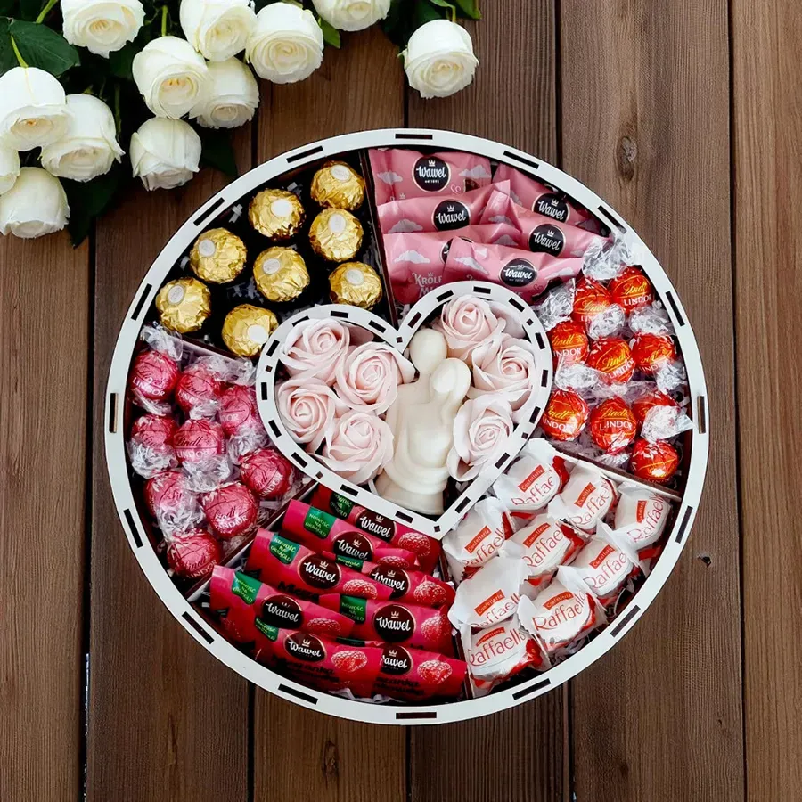 Dużym wyróżnikiem tego modelu jest układ przegródek z centralnym sercem oraz drewniany napis „W dniu ślubu”. Taki układ buduje czytelny, ślubny charakter i sprawia, że box nie wygląda przypadkowo. To ważne przy prezentach na taką okazję, bo liczy się zarówno estetyka, jak i spójność całej kompozycji.