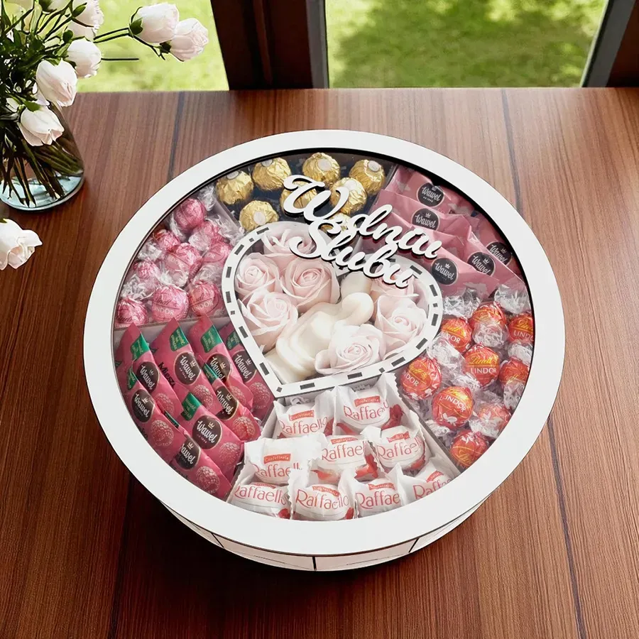 Pudełko wykonano z białej płyty HDF, dlatego całość prezentuje się schludnie, stabilnie i estetycznie. Transparentny otwór w wieczku eksponuje wnętrze jeszcze przed otwarciem, dzięki czemu prezent od razu wygląda na dopracowany i gotowy do wręczenia.