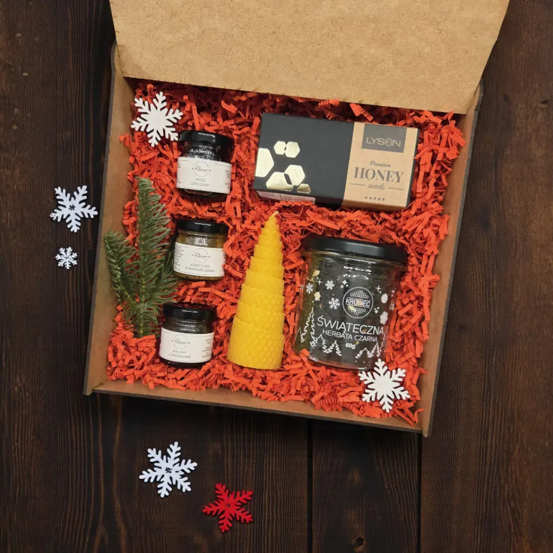 Wewnątrz znalazły się produkty, które idealnie oddają klimat świąt. 🍯 Miód gryczany zachwyca intensywnym, głębokim smakiem, idealnym do zimowych herbat i deserów. 🍊 Konfitura pomarańczowa to klasyczny, aromatyczny dodatek o obniżonej zawartości cukru, który świetnie komponuje się z zimowymi wypiekami. 🍓 Maliny z migdałami to słodko-kwaskowy duet, a 🍵 herbata świąteczna pełna jest aromatów, które przywołują atmosferę grudniowych wieczorów. Dopełnieniem zestawu jest 🍬 krówka miodowa Sweet Honey, która dodaje całości słodkiego, zimowego akcentu.