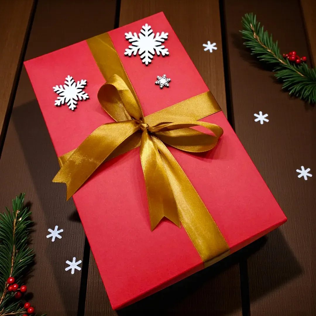 - 🎁 Pudełko: czerwone, ozdobne, płatki śniegu, złota wstążka