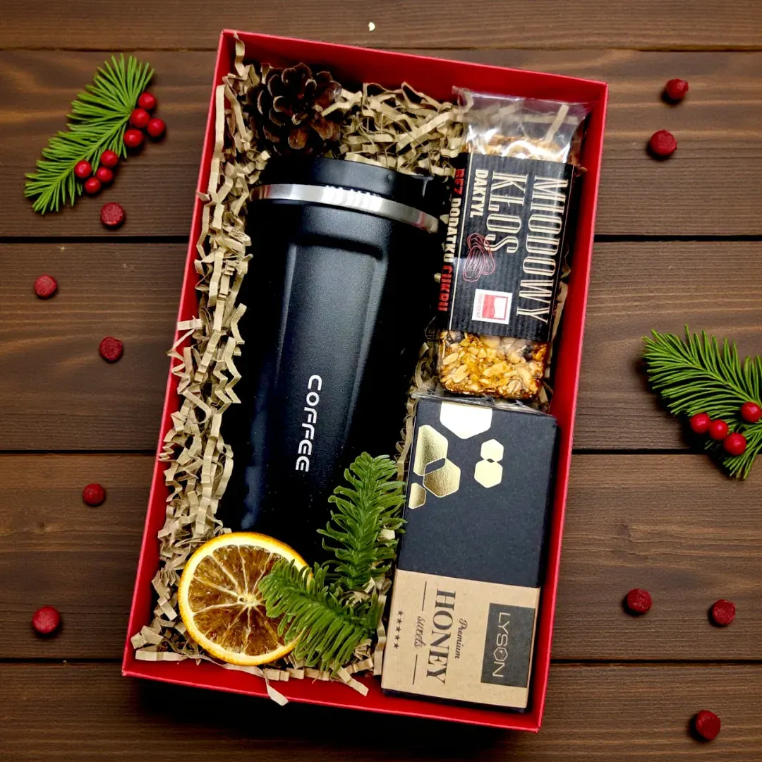 W środku zestawu znajduje się połączenie praktycznego gadżetu i naturalnej słodyczy. ☕ Czarny termos z wyświetlaczem to elegancki i nowoczesny dodatek, idealny do pracy, samochodu czy na spacer. Utrzymuje temperaturę napojów i wygląda wyjątkowo minimalistycznie. 🍬 Krówka Miodowa Sweet Honey dodaje zestawowi słodkiego charakteru, a 🌾 miodowy kłos daktylowy to zdrowa przekąska, która świetnie podkreśla zimowe aromaty.