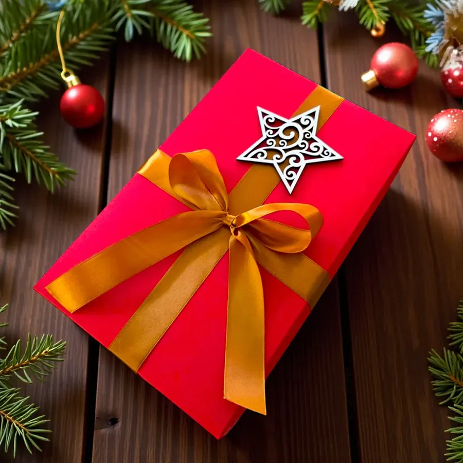Pudełko wykonane z ozdobnego kartonu w kolorze czerwieni symbolizuje radość, energię i bliskość. Złota wstążka dodaje mu klasy, a ozdobna gwiazdka subtelnie podkreśla świąteczny klimat. Dzięki kompaktowym wymiarom zestaw prezentuje się doskonale zarówno pod choinką, jak i na świątecznym stole. 🎀