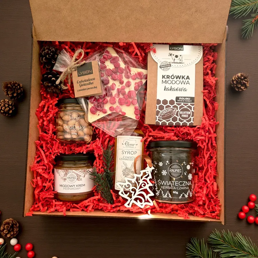 Czekolada biała gwiazdka z miodem i porzeczkami to połączenie delikatności i naturalnej słodyczy, migdały w miodzie są chrupiące i pachnące, a miodowy krem piernikowy to kwintesencja świątecznych smaków. Herbata świąteczna rozgrzewa aromatem przypraw, syrop z kwiatu czarnego bzu doda zdrowia i energii, a miodowe krówki osłodzą każdą chwilę. Całość uzupełnia ozdobna bombka, która wnosi do wnętrza świąteczny blask. 💛
