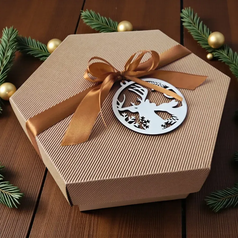 - 🎁 Pudełko: ozdobny karton, bombka, złota wstążka