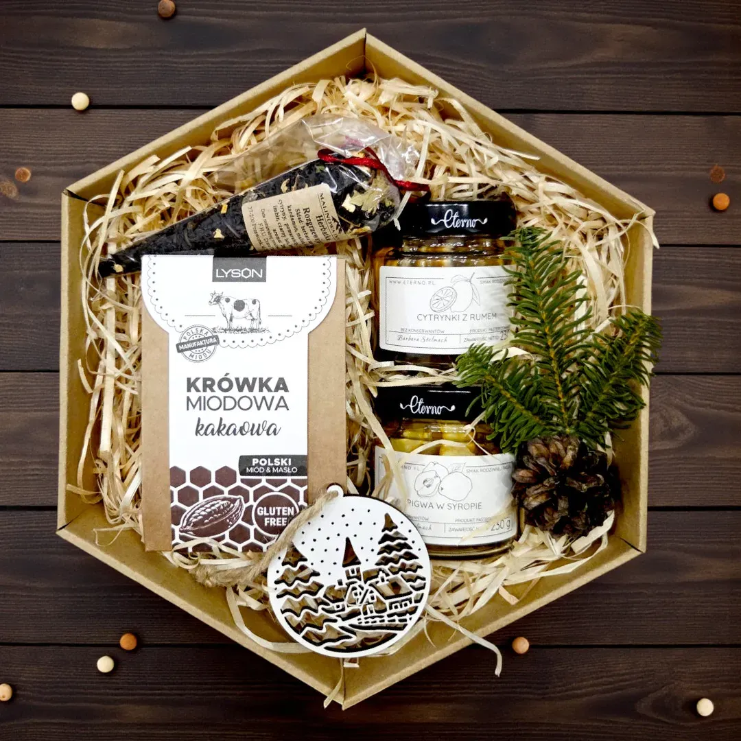 W środku zestawu znajdują się produkty, które doskonale pasują do zimowych wieczorów. 🍵 Herbatka rozgrzewająca otuli aromatem przypraw i cytrusów, tworząc idealny napój na rodzinne rozmowy. 🍬 Miodowe krówki kakaowe zachwycą swoją miękką, kremową słodyczą, a 🍋 pigwa w syropie oraz 🍊 cytrynki w rumie dodadzą świątecznej wyrazistości – świetnie sprawdzą się jako dodatki do herbaty, deserów i zimowych napojów.