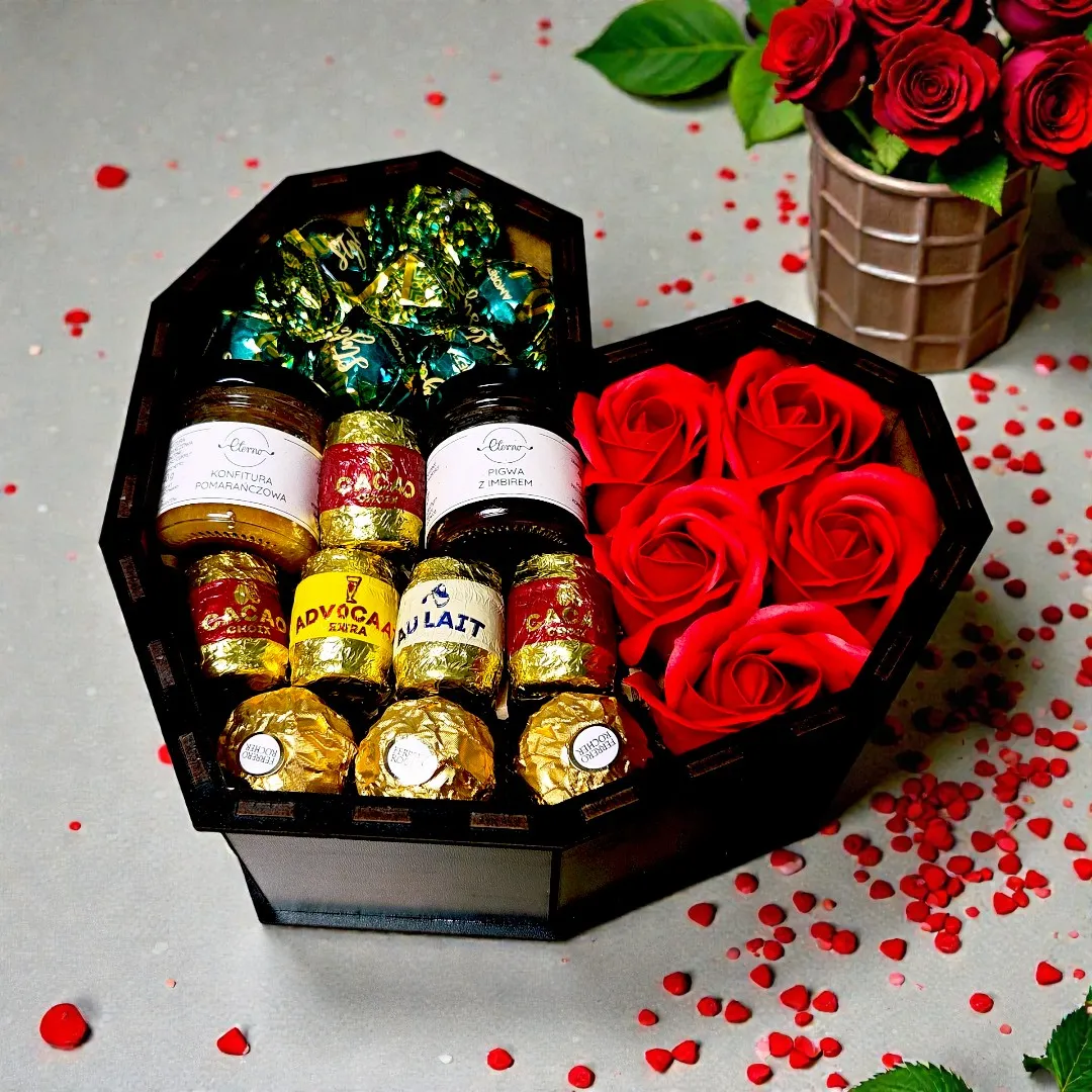 Czarne serce z czerwonymi różami i słodkim wnętrzem dobrze odpowiada na taką potrzebę. Łączy mocną kolorystykę, romantyczne detale, słodycze i dodatki w słoiczkach, dzięki czemu całość prezentuje się spójnie i od razu jest gotowa do podarowania bliskiej osobie.
